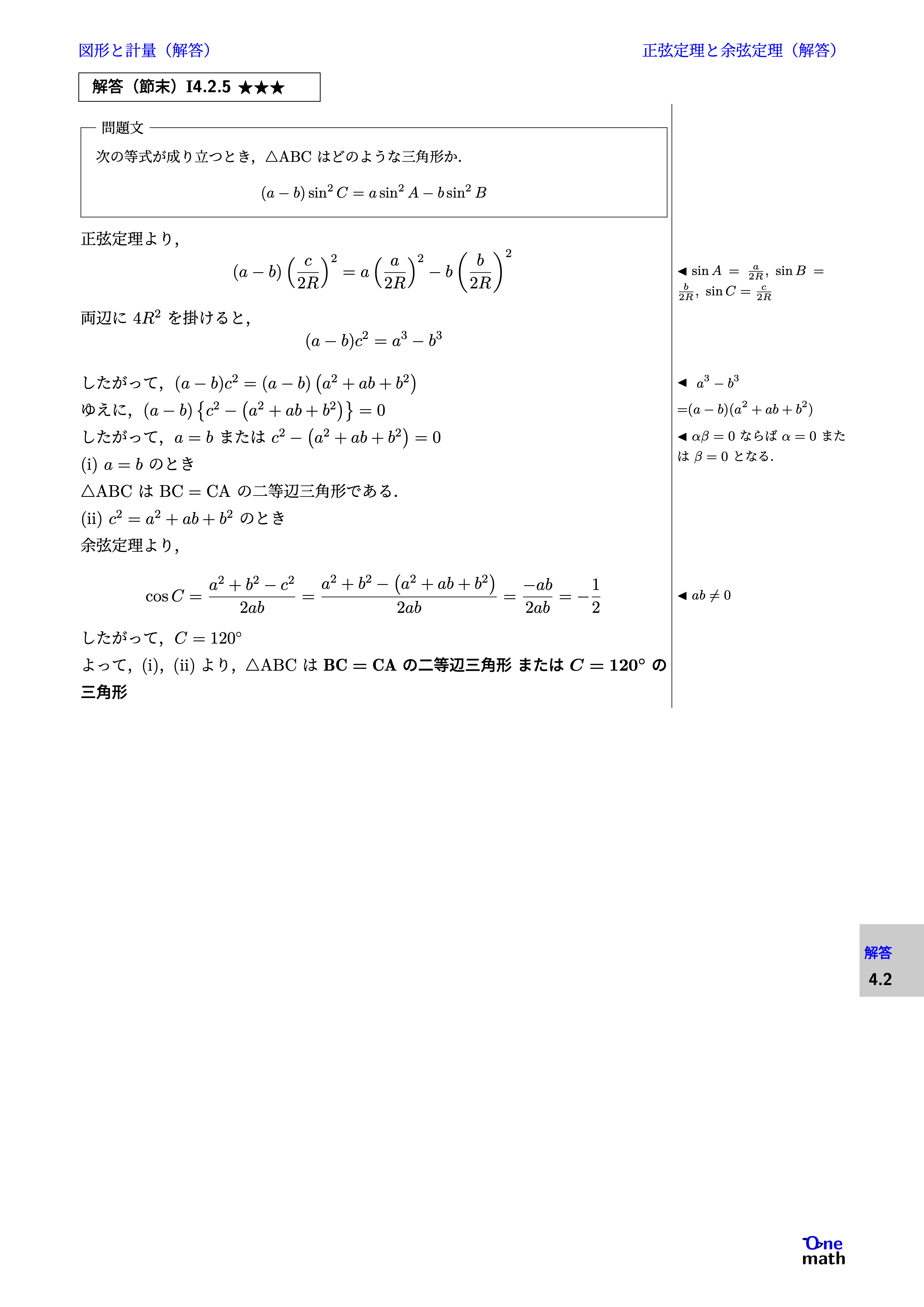 正弦定理より, $$ (a-b)\left(\frac{c}{2 R}\right)^2=a\left(\frac{a}{2 R}\right)^2-b\left(\frac{b}{2 R}\right)^2 $$ 両辺に$4 R^2$を掛けると, $$ (a-b)c^2=a^3-b^3 $$ したがって, $ (a-b)c^2=(a-b)\left(a^2+ab+b^2\right) $ ゆえに, $ (a-b)\left\{c^2-\left(a^2+ab+b^2\right)\right\}=0 $ したがって,$a=b$または$c^2-\left(a^2+ab+b^2\right)=0$ (i)$a=b$のとき $\triangle \mathrm{ABC}$は$\mathrm{BC}=\mathrm{CA}$の二等辺三角形である. (ii)$c^2=a^2+ab+b^2$のとき 余弦定理より, $$ \cos C=\frac{a^2+b^2-c^2}{2 ab}=\frac{a^2+b^2-\left(a^2+ab+b^2\right)}{2ab}=\frac{-ab}{2ab}=-\frac{1}{2} $$ したがって,$C=120^{\circ}$ よって,(i),(ii)より,$\triangle \mathrm{ABC}$は $\mathrm{BC}=\mathrm{CA}$の二等辺三角形または$C=120^{\circ}$の三角形