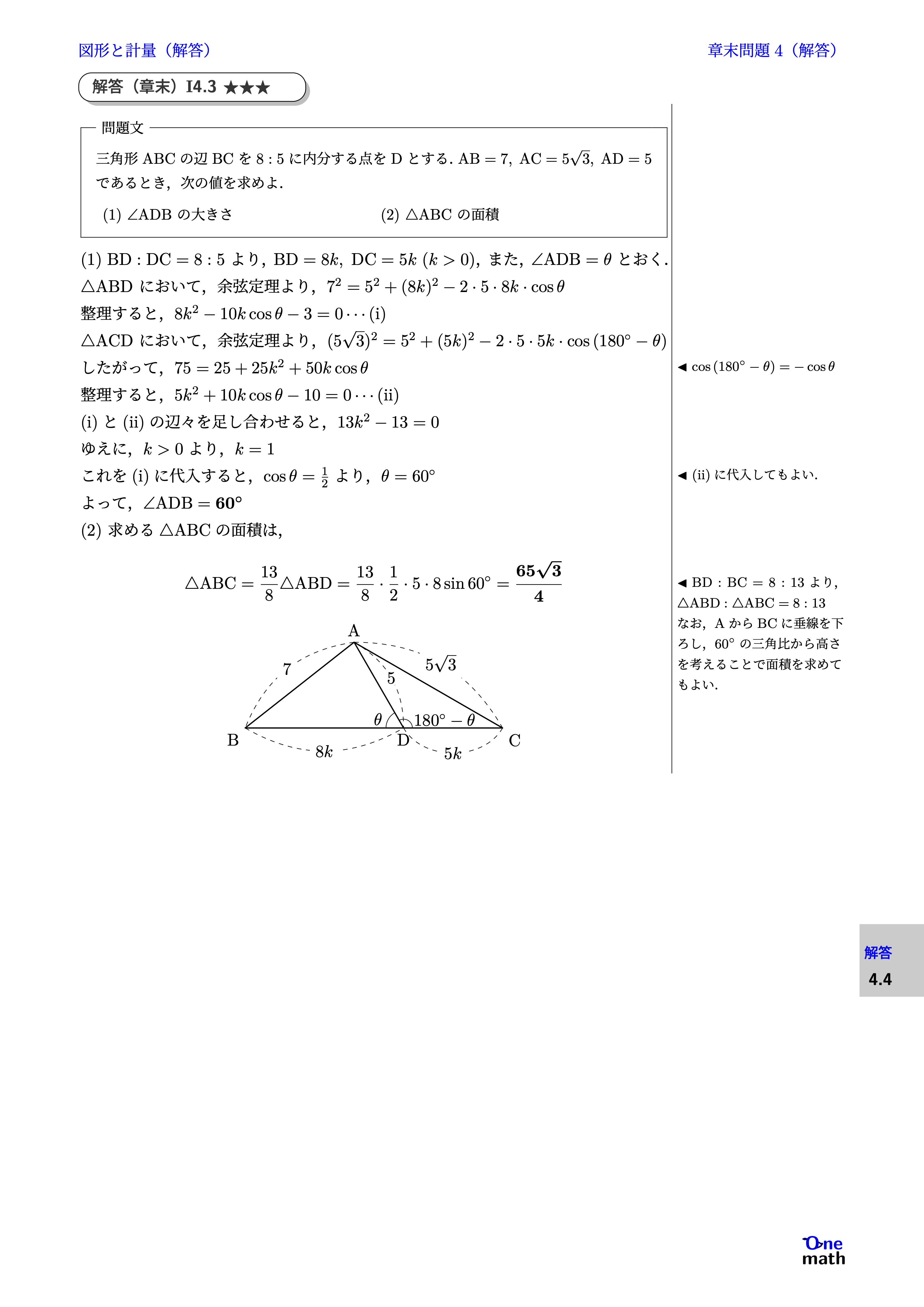 (1)$\mathrm{BD}: \mathrm{DC}=8: 5$より, $ \mathrm{BD}=8 k, \mathrm{DC}=5 k(k>0) $,また, $\angle \mathrm{A D B}=\theta$とおく. $\triangle \mathrm{ABD}$において,余弦定理より, $ 7^2=5^2+(8 k)^2-2 \cdot 5 \cdot 8 k\cdot \cos \theta $ 整理すると,$8k^2-10 k \cos \theta-3=0 \cdots(\mathrm{i})$ $\triangle \mathrm{ACD}$において,余弦定理より, $ ({5\sqrt{3}})^2=5^2+(5 k)^2-2 \cdot 5 \cdot 5k\cdot \cos \left(180^{\circ}-\theta\right) $ したがって,$75=25+25k^2+50 k \cos \theta$ 整理すると,$5k^2+10k \cos \theta-10=0 \cdots(\mathrm{ii})$ (i)と(ii)の辺々を足し合わせると,$13k^2-13=0$ ゆえに,$k>0$より,$k=1$ これを(i)に代入すると,$\cos\theta=\frac{1}{2}$より,$\theta=60^\circ$ よって,$\angle \mathrm{ADB}=60^\circ$ (2)求める$\triangle \mathrm{ABC}$の面積は, $$\triangle \mathrm{ABC}=\frac{13}{8} \triangle \mathrm{ABD}=\frac{13}{8} \cdot \frac{1}{2} \cdot 5 \cdot 8 \sin 60^{\circ}=\frac{65 \sqrt{3}}{4}$$