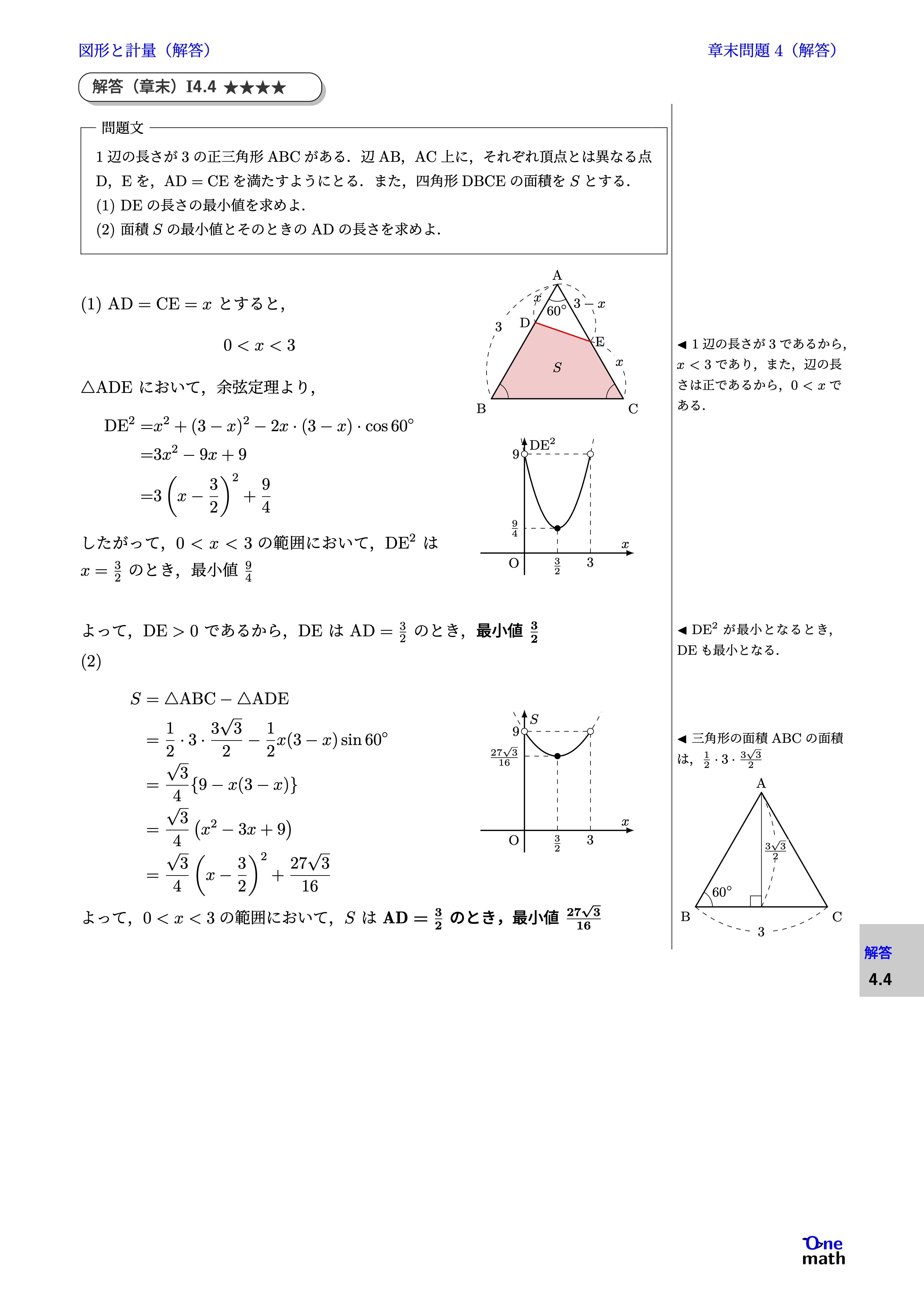 (1)$\mathrm{AD}=\mathrm{CE}=x$とすると, $$0<x<3$$ $\triangle \mathrm{ADE}$において,余弦定理より, $$ \begin{aligned} \mathrm{DE}^2=& x^2+(3-x)^2-2 x\cdot(3-x)\cdot \cos 60^{\circ} \\ =& 3x^2-9x+9 \\ =& 3\left(x-\frac{3}{2}\right)^2+\frac{9}{4} \end{aligned} $$ したがって,$0<x<3$の範囲において,$\mathrm{DE}^2$は$x=\frac{3}{2}$のとき,最小値$\frac{9}{4}$ よって,$\mathrm{DE}>0$であるから,DEは$\mathrm{AD}=\frac{3}{2}$のとき,最小値$\frac{3}{2}$ (2) $$ \begin{aligned} S &=\triangle \mathrm{ABC}-\triangle \mathrm{ADE} \\ &=\frac{1}{2}\cdot 3\cdot \frac{3\sqrt{3}}{2}-\frac{1}{2} x(3-x)\sin 60^{\circ}\\ &=\frac{\sqrt{3}}{4}\{9-x(3-x)\} \\ &=\frac{\sqrt{3}}{4}\left(x^2-3 x+9\right)\\ &=\frac{\sqrt{3}}{4}\left(x-\frac{3}{2}\right)^2+\frac{27\sqrt{3}}{16} \end{aligned} $$ よって,$0<x<3$の範囲において,$S$は$\mathrm{AD}=\frac{3}{2}$のとき,最小値$\frac{27\sqrt{3}}{16}$