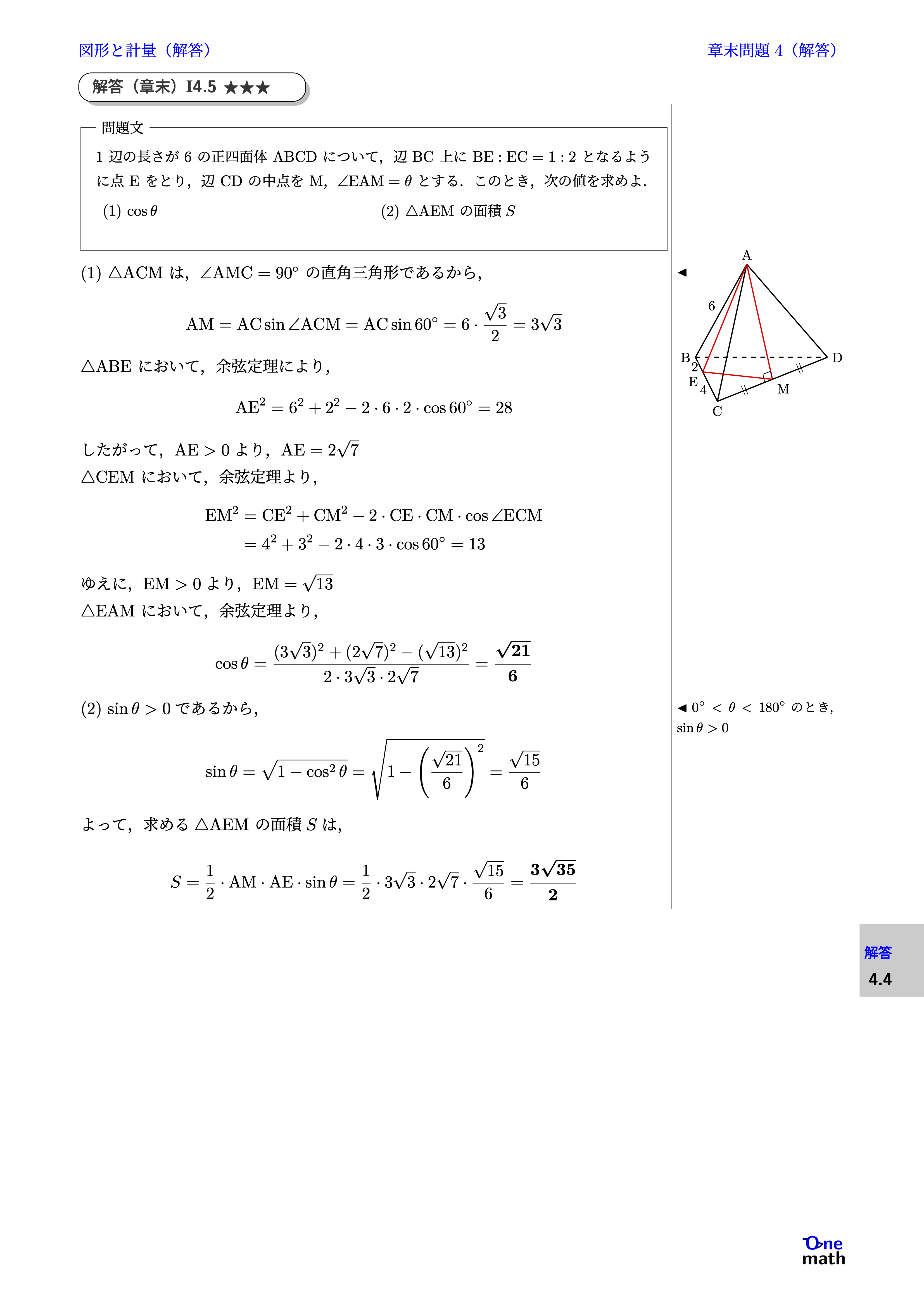 1辺の長さが6の正四面体ABCDについて,辺BC上に$\mathrm{BE}: \mathrm{EC}=1: 2$となるように点Eをとり,辺CDの中点をM,$\angle \mathrm{EAM}=\theta$とする.このとき,次の値を求めよ. (1)$\cos \theta$ (2)$\triangle \mathrm{AEM}$の面積$S$