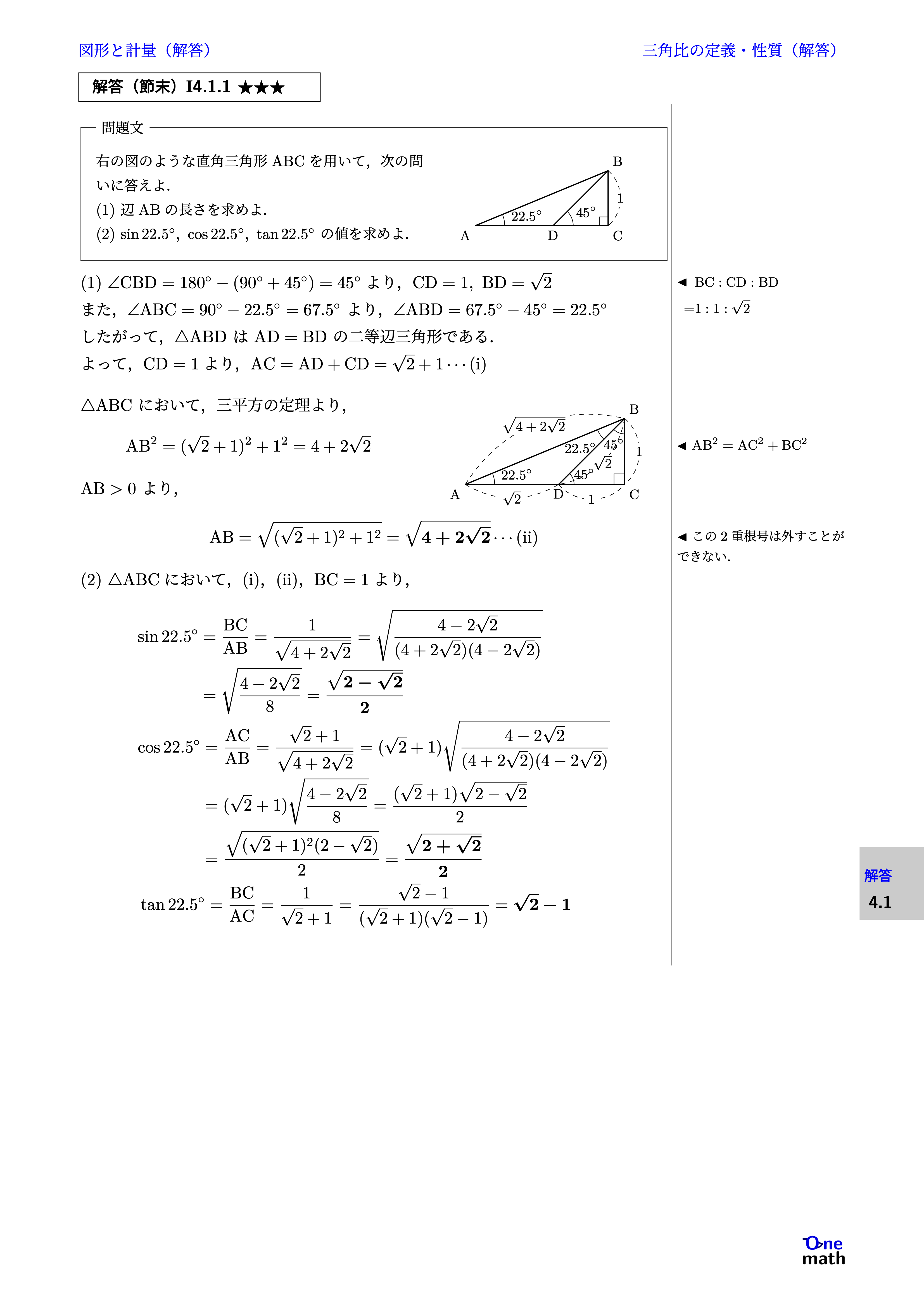 (1)$\angle \mathrm{CBD}=180^\circ-(90^\circ+45^{\circ})=45^\circ$より,$\mathrm{CD=1, \mathrm{BD}=\sqrt{2} }$ また,$\angle \mathrm{ABC}=90^{\circ}-22.5^{\circ}=67.5^{\circ}$より,$\angle \mathrm{ABD}=67.5^{\circ}-45^{\circ}=22.5^{\circ}$ したがって,$\triangle \mathrm{ABD}$は$\mathrm{AD}=\mathrm{BD}$の二等辺三角形である. よって,$\mathrm{CD}=1$より,$\mathrm{AC}=\mathrm{AD}+\mathrm{CD}=\sqrt{2}+1\cdots(\mathrm{i})$ $\triangle \mathrm{ABC}$において,三平方の定理より, $$ \mathrm{AB}^2=(\sqrt{2}+1)^2+1^2=4+2\sqrt{2} $$ $\mathrm{AB}>0$より, $$ \mathrm{AB}=\sqrt{(\sqrt{2}+1)^2+1^2}=\sqrt{4+2\sqrt{2}}\cdots(\mathrm{ii}) $$ (2)$\triangle \mathrm{ABC}$において,(i),(ii),$\mathrm{BC}=1$より, $$ \begin{aligned} &\begin{aligned} \sin 22.5^{\circ}&=\frac{\mathrm{BC}}{\mathrm{AB}}=\frac{1}{\sqrt{4+2\sqrt{2}}}=\sqrt{\frac{4-2\sqrt{2}}{(4+2\sqrt{2})(4-2\sqrt{2})}}\\ &=\sqrt{\frac{4-2\sqrt{2}}{8}}=\frac{\sqrt{2-\sqrt{2}}}{2} \end{aligned} \\& \begin{aligned} \cos 22.5^{\circ}&=\frac{\mathrm{AC}}{\mathrm{AB}}=\frac{\sqrt{2}+1}{\sqrt{4+2\sqrt{2}}} =(\sqrt{2}+1)\sqrt{\frac{4-2\sqrt{2}}{(4+2\sqrt{2})(4-2\sqrt{2})}} \\ &=(\sqrt{2}+1)\sqrt{\frac{4-2\sqrt{2}}{8}}=\frac{(\sqrt{2}+1)\sqrt{2-\sqrt{2}}}{2} \\ &=\frac{\sqrt{(\sqrt{2}+1)^2(2-\sqrt{2})}}{2}=\frac{\sqrt{2+\sqrt{2}}}{2} \end{aligned} \\& \tan 22.5^{\circ}=\frac{\mathrm{BC}}{\mathrm{AC}}=\frac{1}{\sqrt{2}+1}=\frac{\sqrt{2}-1}{(\sqrt{2}+1)(\sqrt{2}-1)}=\sqrt{2}-1 \end{aligned} $$