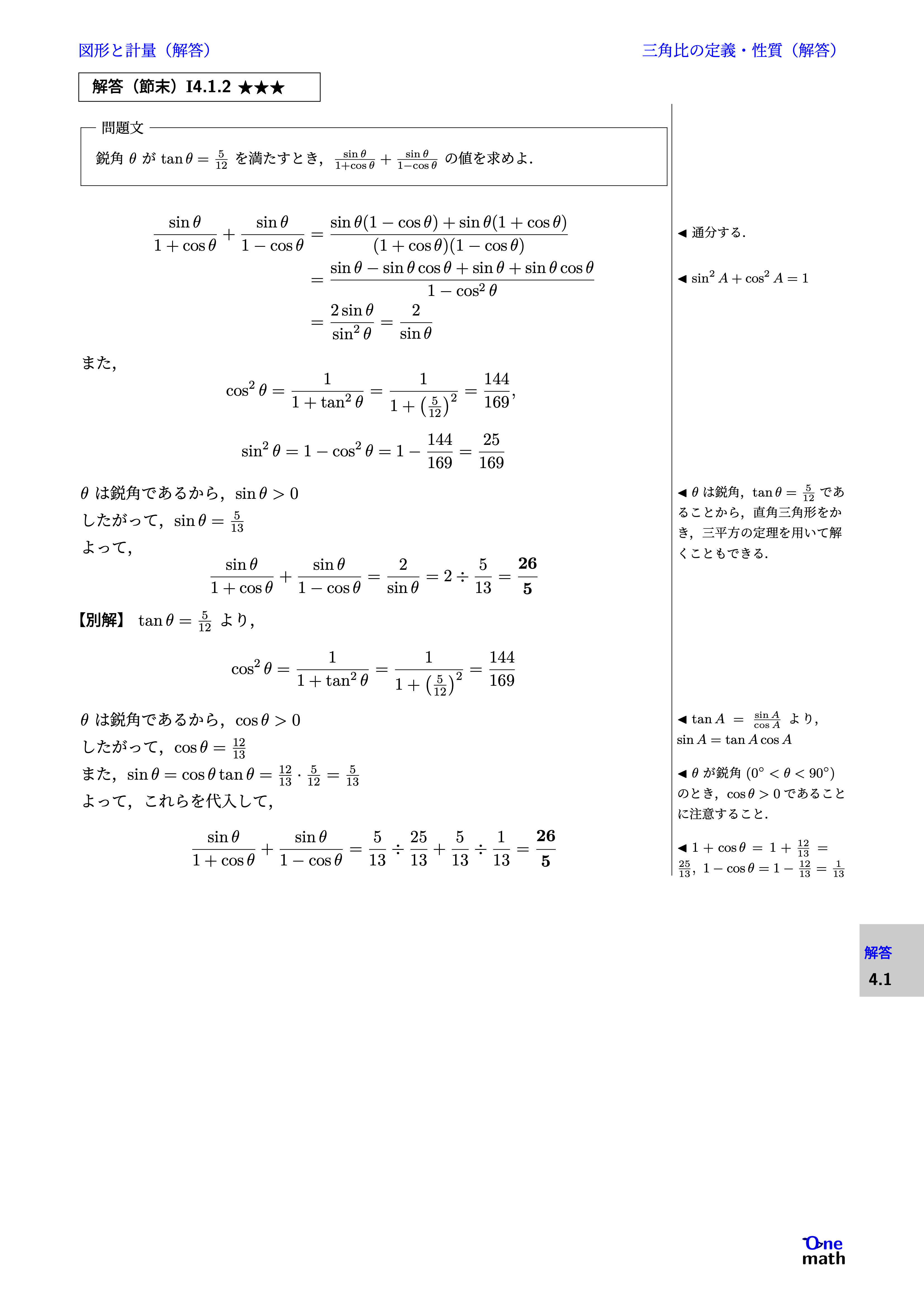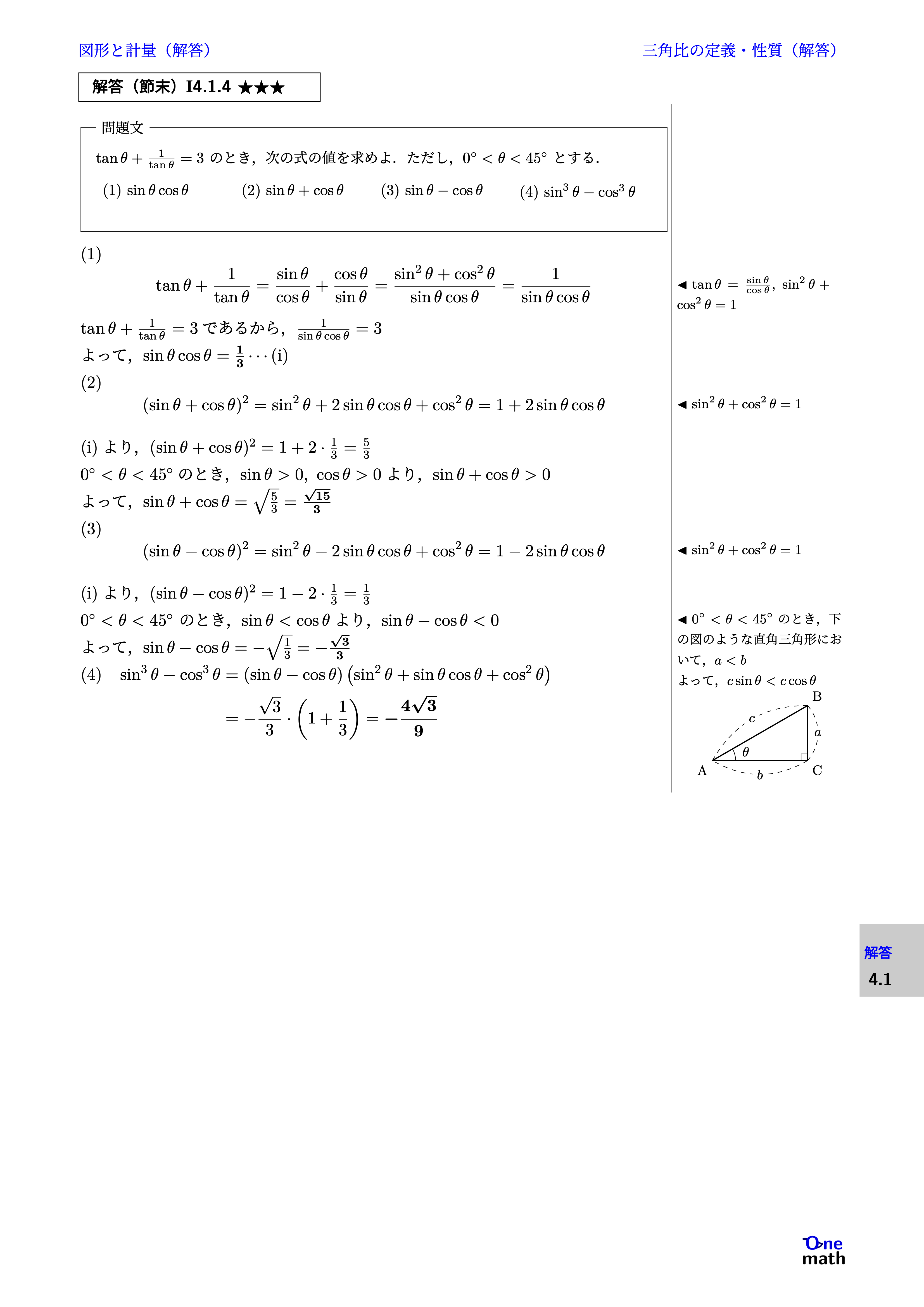 【数学I】例題4.1.4:三角比の相互関係1(One More)★ https://www.youtube.com/watch?v=8pupndyHx48 問題の解答 検索用コード(LaTeX) % 例題I4.1.4:三角比の相互関係1 (One More)★ $A$は鋭角とする.このとき,次の問い...