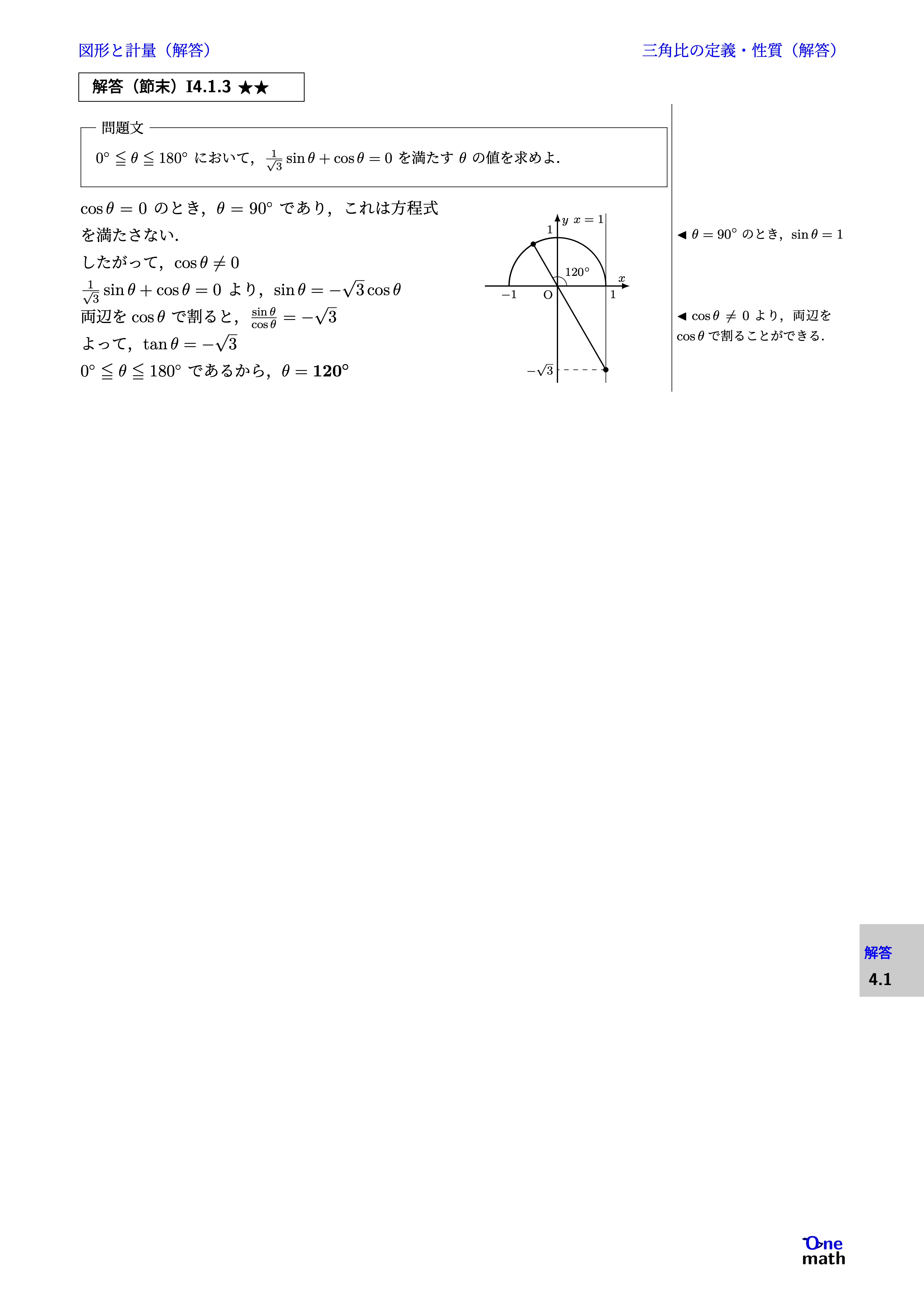 $\cos \theta=0$のとき,$\theta=90^{\circ}$であり,これは方程式を満たさない. したがって,$\cos \theta \neq 0$ $\frac{1}{\sqrt{3}}\sin \theta+\cos \theta=0$より,$\sin \theta=-\sqrt{3}\cos \theta$ 両辺を$\cos \theta$で割ると,$\frac{\sin \theta}{\cos \theta}=-{\sqrt{3}}$ よって,$\tan \theta=-{\sqrt{3}}$ $0^{\circ} \leqq \theta \leqq 180^{\circ}$であるから,$\theta=120^{\circ}$