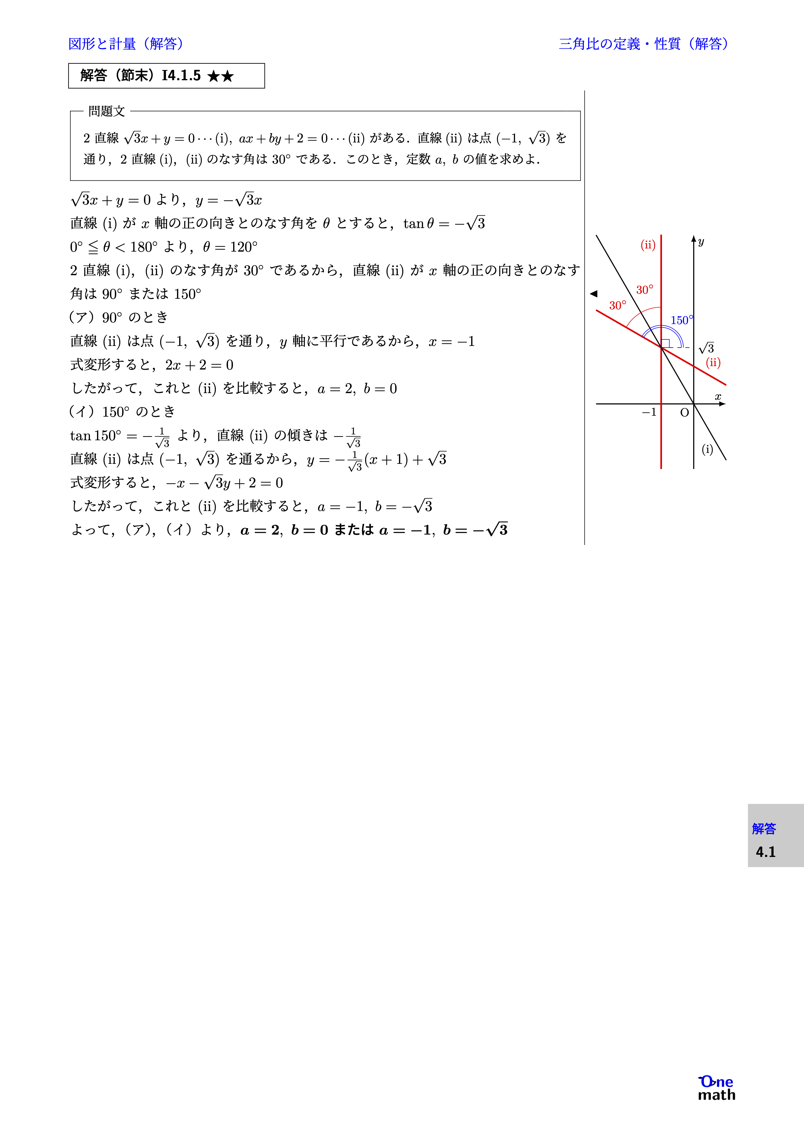 $\sqrt{3} x+y=0$より,$y=-\sqrt{3} x$ 直線(i)が$x$軸の正の向きとのなす角を$\theta$とすると, $ \tan \theta=-\sqrt{3} $ $0^{\circ} \leqq \theta<180^{\circ}$より,$\theta=120^{\circ}$ 2直線(i),(ii)のなす角が$30^{\circ}$であるから,直線(ii)が$x$軸の正の向きとのなす角は$90^{\circ}$または$150^{\circ}$ (ア)$90^{\circ}$のとき 直線(ii)は点$(-1, \sqrt{3})$を通り,$y$軸に平行であるから, $ x=-1 $ 式変形すると,$2x+2=0$ したがって,これと(ii)を比較すると, $ a=2, b=0 $ (イ)$150^{\circ}$のとき $\tan 150^{\circ}=-\frac{1}{\sqrt{3}}$より,直線(ii)の傾きは$-\frac{1}{\sqrt{3}}$ 直線(ii)は点$(-1, \sqrt{3})$を通るから, $ y=-\frac{1}{\sqrt{3}}(x+1)+\sqrt{3} $ 式変形すると,$-x-\sqrt{3} y+2=0$ したがって,これと(ii)を比較すると, $a=-1, b=-\sqrt{3}$ よって,(ア),(イ)より, $ a=2 , b=0 $ または$ a=-1 , b=-\sqrt{3}$