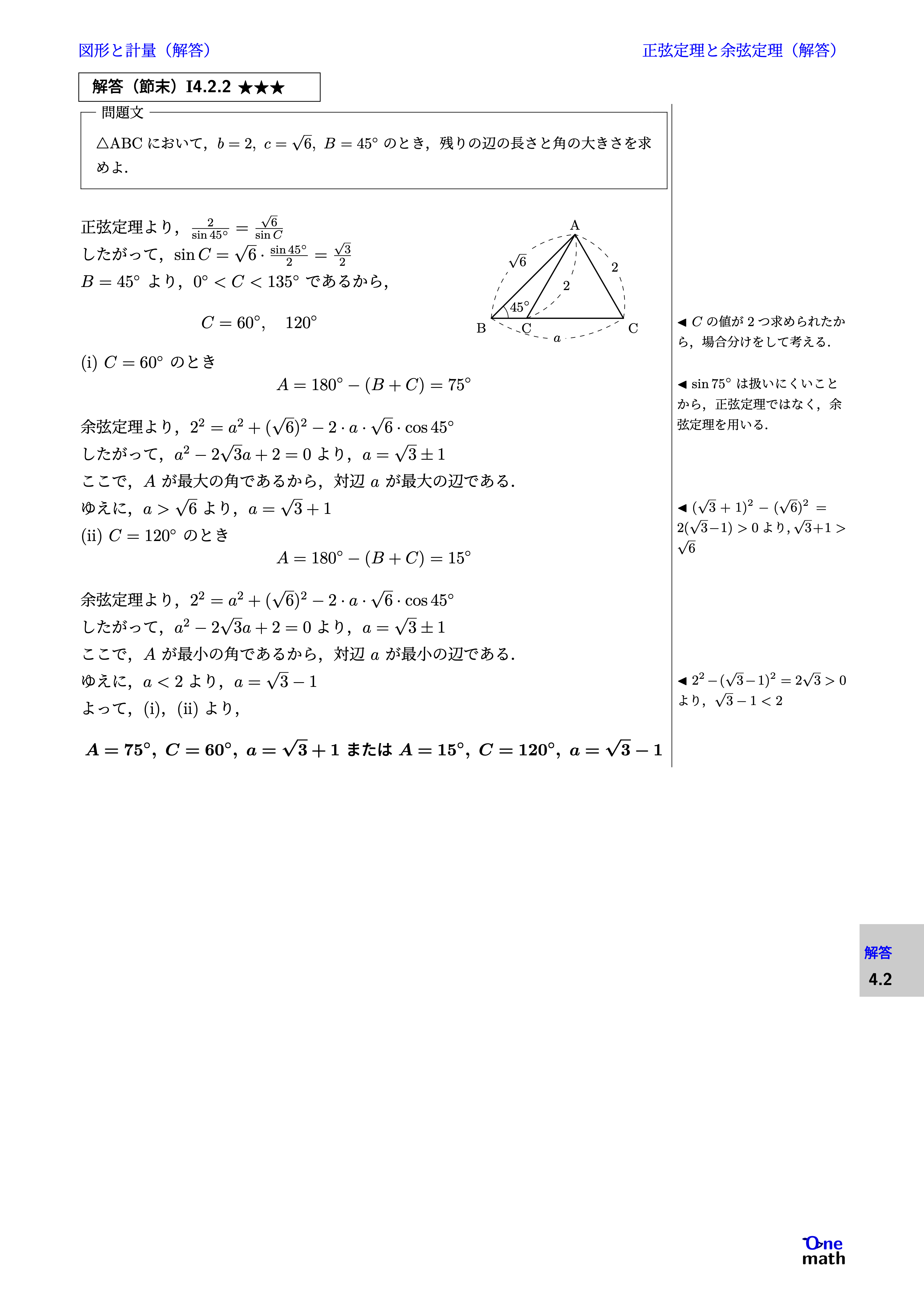 正弦定理より,$\frac{2}{\sin 45^{\circ}}=\frac{\sqrt{6}}{\sin C}$ したがって, $ \sin C=\sqrt{6} \cdot \frac{\sin 45^{\circ}}{2}=\frac{\sqrt{3}}{2} $ $B=45^{\circ}$より,$0^{\circ}<C<135^{\circ}$であるから, $$C=60^{\circ}, 120^{\circ}$$ (i)$C=60^{\circ}$のとき $$ A=180^{\circ}-(B+C)=75^{\circ} $$ 余弦定理より, $ 2^2=a^2+(\sqrt{6})^2-2 \cdot a \cdot \sqrt{6} \cdot \cos 45^{\circ} $ したがって, $ a^2-2\sqrt{3} a+2=0 $より,$a=\sqrt{3} \pm 1$ ここで,$A$が最大の角であるから,対辺$a$が最大の辺である. ゆえに,$a>\sqrt{6}$より,$a=\sqrt{3}+1$ (ii)$C=120^{\circ}$のとき $$ A=180^{\circ}-(B+C)=15^{\circ} $$ 余弦定理より, $ 2^2=a^2+(\sqrt{6})^2-2 \cdot a \cdot \sqrt{6} \cdot \cos 45^{\circ} $ したがって, $ a^2-2\sqrt{3}a+2=0 $より,$a=\sqrt{3}\pm 1$ ここで,$A$が最小の角であるから,対辺$a$が最小の辺である. ゆえに,$a<2$より,$a=\sqrt{3}-1$ よって,(i),(ii)より, $$ A=75^{\circ}, C=60^{\circ}, a=\sqrt{3}+1 \text{ または } A=15^{\circ}, C=120^{\circ}, a=\sqrt{3}-1 $$