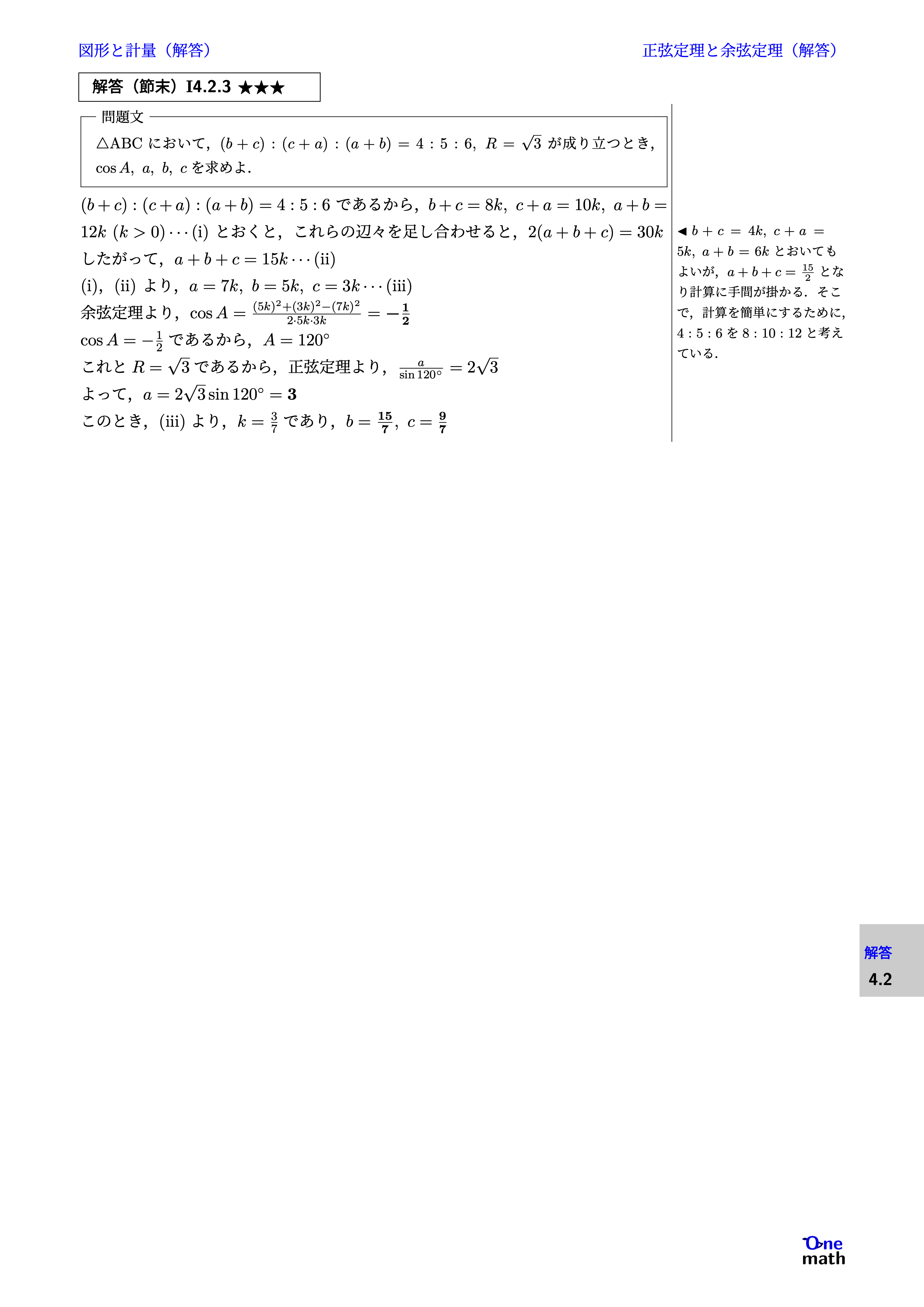 $(b+c):(c+a):(a+b)=4: 5: 6$であるから, $ b+c=8 k, c+a=10 k, a+b=12 k(k>0)\cdots(\mathrm{i}) $ とおくと,これらの辺々を足し合わせると, $ 2(a+b+c)=30 k $ したがって, $ a+b+c=15 k\cdots(\mathrm{ii}) $ (i),(ii)より,$a=7 k, b=5 k, c=3 k\cdots(\mathrm{iii})$ 余弦定理より,$\cos A=\frac{(5 k)^2+(3 k)^2-(7 k)^2}{2 \cdot 5 k \cdot 3 k}=-\frac{1}{2}$ $\cos A=-\frac{1}{2}$であるから,$A=120^\circ$ これと$R=\sqrt{3}$であるから,正弦定理より, $\frac{a}{\sin120^\circ}=2\sqrt{3}$ よって,$a=2\sqrt{3}\sin120^\circ=3$ このとき,(iii)より,$k=\frac{3}{7}$であり,$b=\frac{15}{7}, c=\frac{9}{7}$