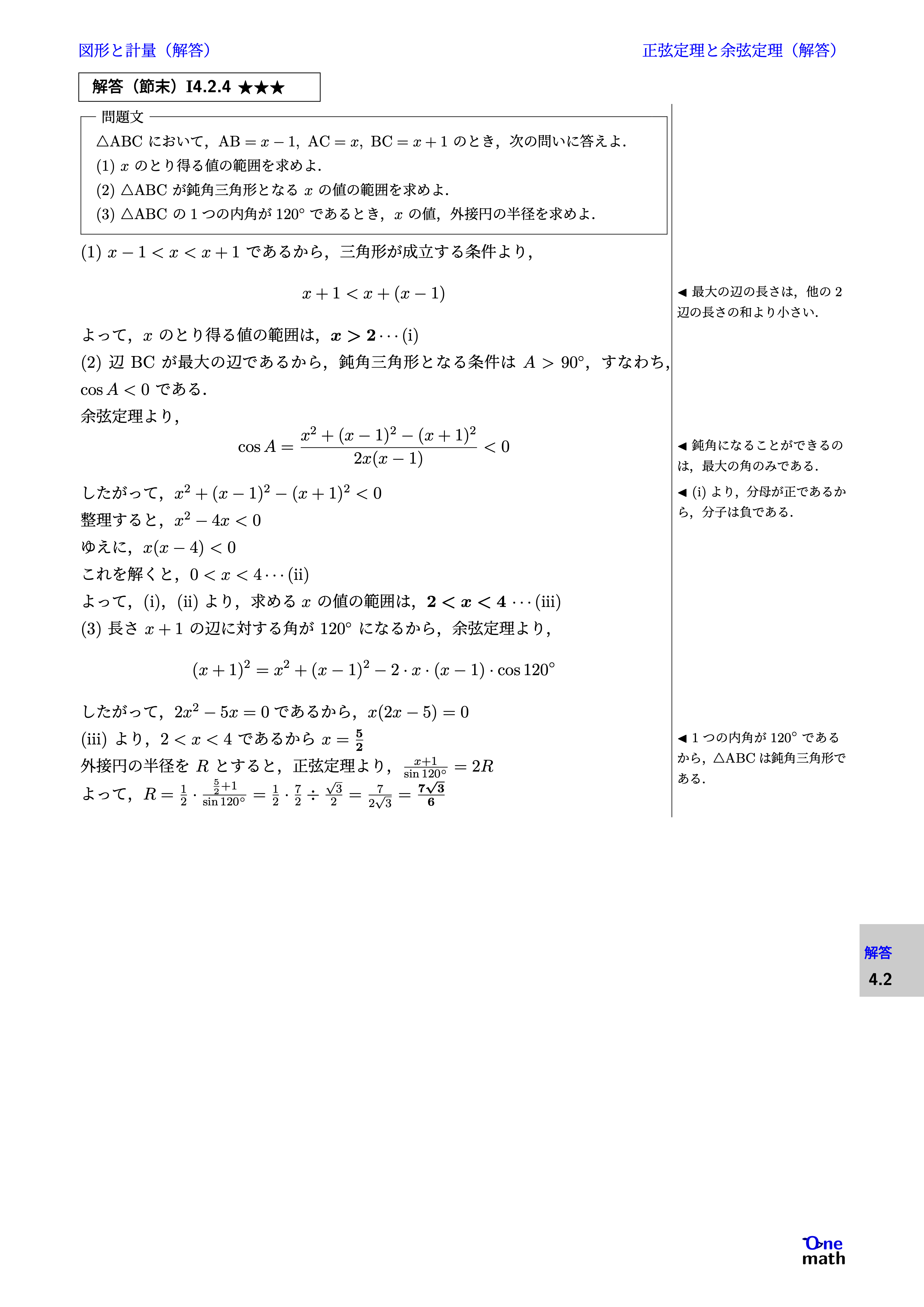 (1) $x-1<x<x+1$であるから,三角形が成立する条件より,$$x+1<x+(x-1)$$ よって,$x$のとり得る値の範囲は,$x>2\cdots(\mathrm{i})$ (2)辺$\mathrm{BC}$が最大の辺であるから,鈍角三角形となる条件は$A>90^{\circ}$,すなわち,$\cos A<0$である. 余弦定理より, $$ \cos A=\frac{ x^2+(x-1)^2-(x+1)^2}{2x(x-1)}<0 $$ したがって,$x^2+(x-1)^2-(x+1)^2<0$ 整理すると,$x^2-4x<0$ ゆえに,$x(x-4)<0$ これを解くと,$0<x<4 \cdots(\mathrm{ii})$ よって,(i),(ii)より,求める$x$の値の範囲は,$2<x<4$$\cdots(\mathrm{iii})$ (3)長さ$x+1$の辺に対する角が$120^{\circ}$になるから,余弦定理より, $$ (x+1)^2=x^2+(x-1)^2-2\cdot x\cdot(x-1)\cdot \cos 120^{\circ} $$ したがって,$2x^2-5x=0$であるから,$x(2x-5)=0$ (iii)より,$2<x<4$であるから$x=\frac{5}{2}$ 外接円の半径を$R$とすると,正弦定理より, $\frac{x+1}{\sin 120^{\circ}}=2 R$ よって,$R=\frac{1}{2}\cdot\frac{\frac{5}{2}+1}{\sin 120^\circ}=\frac{1}{2}\cdot\frac{7}{2}\div \frac{\sqrt{3}}{2}=\frac{7}{2\sqrt{3}}=\frac{7\sqrt{3}}{6}$