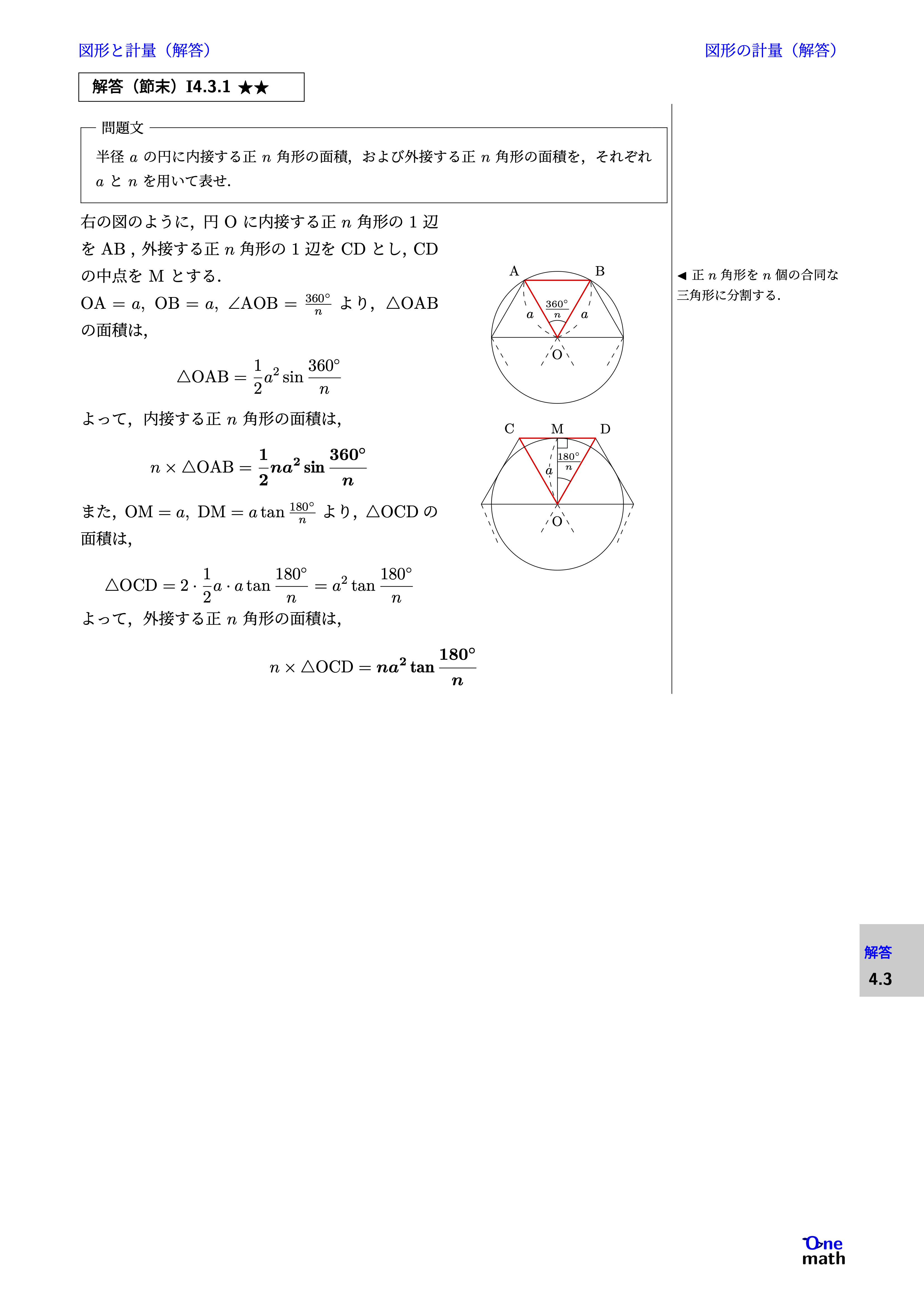 半径$a$の円に内接する正$n$角形の面積,および外接する正$n$角形の面積を,それぞれ$a$と$n$を用いて表せ.