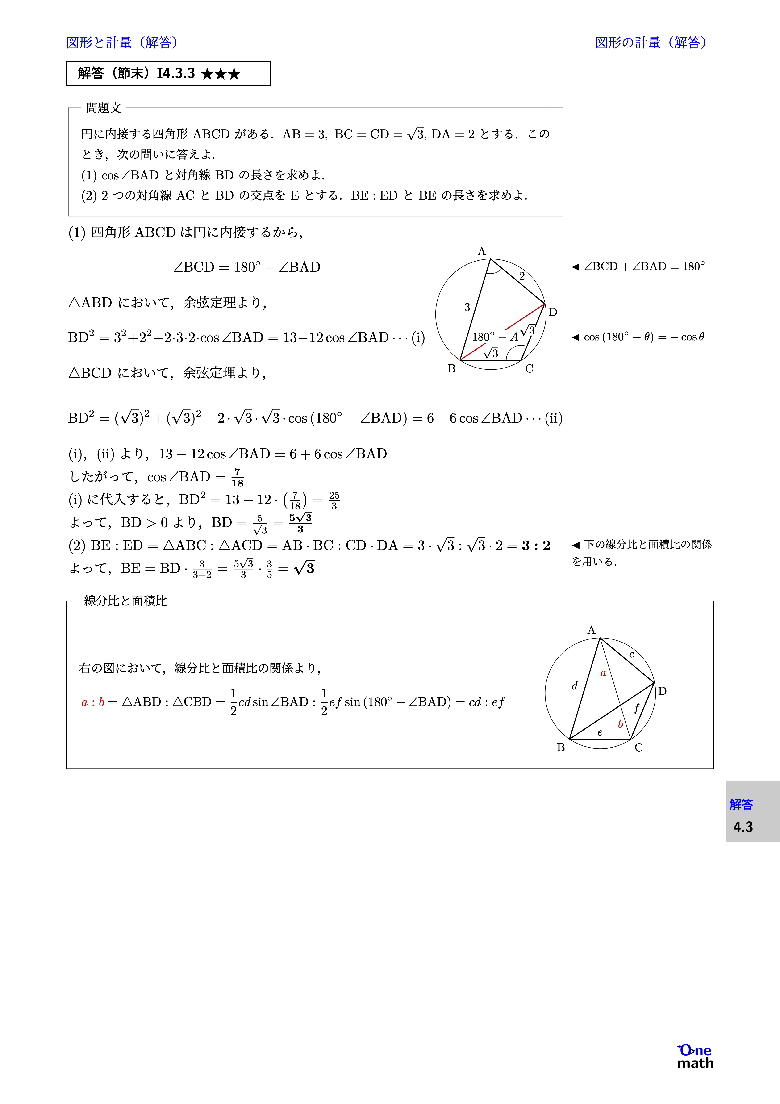 (1)四角形ABCDは円に内接するから, $$\angle{\mathrm{BCD}}=180^\circ-\angle\mathrm{BAD} $$ $\triangle \mathrm{ABD}$において,余弦定理より, $$ \mathrm{BD}^2=3^2+2^2-2 \cdot 3 \cdot 2 \cdot \cos \angle\mathrm{BAD} =13-12 \cos \angle\mathrm{BAD} \cdots(\mathrm{i}) $$ $\triangle \mathrm{BCD}$において,余弦定理より, $$ \mathrm{BD}^2=(\sqrt{3})^2+(\sqrt{3})^2-2 \cdot \sqrt{3} \cdot \sqrt{3} \cdot \cos \left(180^{\circ}-\angle\mathrm{BAD}\right) =6+6 \cos \angle\mathrm{BAD} \cdots(\mathrm{ii}) $$ (i),(ii)より, $ 13-12 \cos \angle\mathrm{BAD}=6+6 \cos \angle\mathrm{BAD} $ したがって,$\cos \angle\mathrm{BAD}=\frac{7}{18}$ (i)に代入すると,$\mathrm{BD}^2=13-12\cdot \left(\frac{7}{18}\right)=\frac{25}{3}$ よって,$\mathrm{BD}>0$より,$\mathrm{BD}=\frac{5}{\sqrt{3}}=\frac{5\sqrt{3}}{3}$ (2)$\mathrm{BE}: \mathrm{ED}=\triangle \mathrm{ABC}: \triangle \mathrm{ACD}=\mathrm{AB} \cdot \mathrm{BC}: \mathrm{CD} \cdot \mathrm{DA} =3 \cdot \sqrt{3}: \sqrt{3} \cdot 2=3: 2 $ よって,$\mathrm{BE}=\mathrm{BD} \cdot \frac{3}{3+2}=\frac{5\sqrt{3}}{3} \cdot \frac{3}{5}=\sqrt{3}$