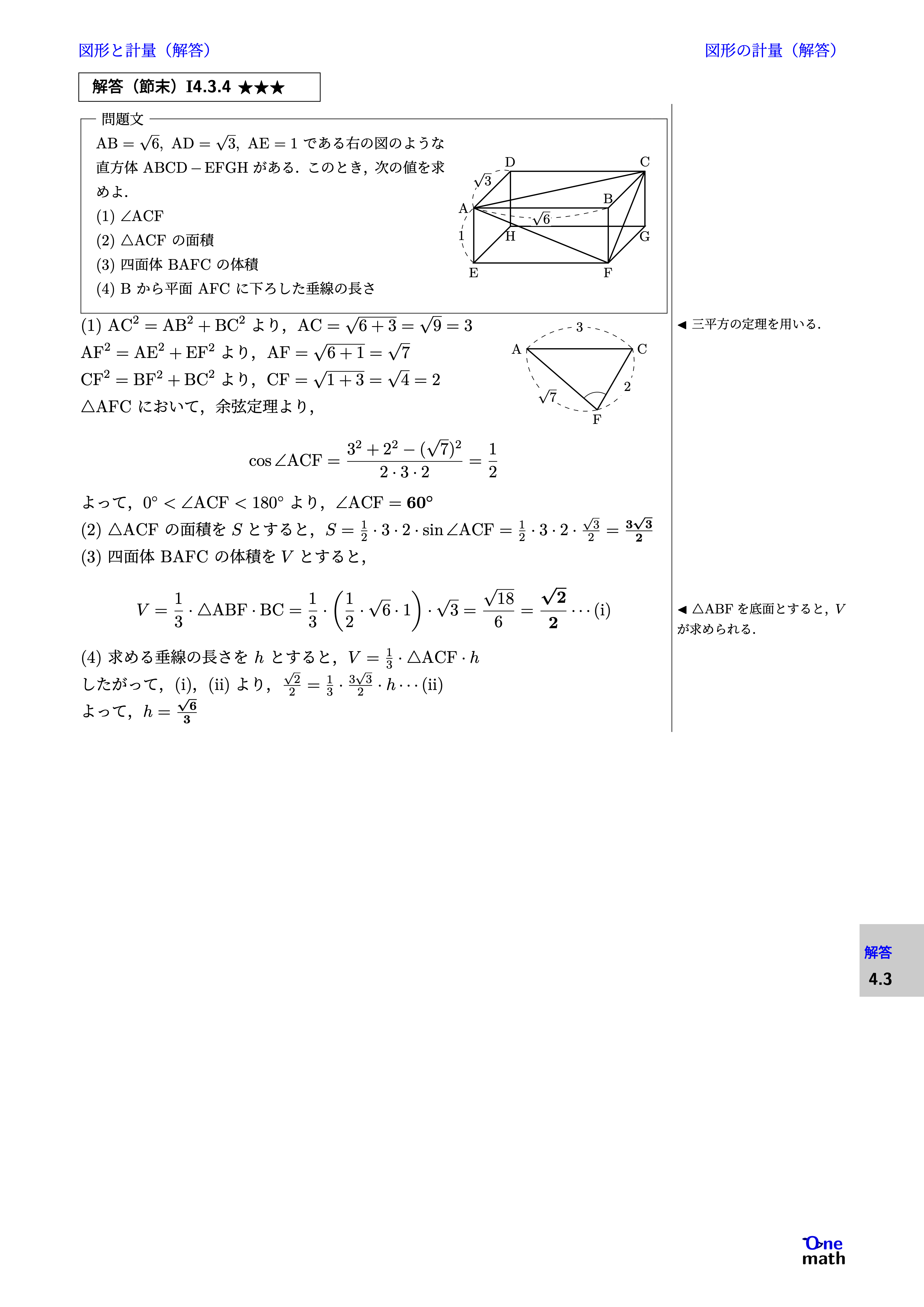 (1)$\mathrm{AC}^2=\mathrm{AB}^2+\mathrm{BC}^2$より,$\mathrm{AC}=\sqrt{6+3}=\sqrt{9}=3$ $\mathrm{AF}^2=\mathrm{AE}^2+\mathrm{EF}^2$より, $\mathrm{AF}=\sqrt{6+1}=\sqrt{7}$ $\mathrm{CF}^2=\mathrm{BF}^2+\mathrm{BC}^2$より, $\mathrm{CF}=\sqrt{1+3}=\sqrt{4}=2$ $\triangle \mathrm{AFC}$において,余弦定理より, $$ \cos \angle \mathrm{ACF}=\frac{3^2+2^2-(\sqrt{7})^2}{2 \cdot 3 \cdot 2}=\frac{1}{2} $$ よって,$0^{\circ}<\angle \mathrm{ACF}<180^{\circ}$より,$\angle \mathrm{ACF}=60^\circ$ (2)$\triangle \mathrm{ACF}$の面積を$S$とすると, $ S=\frac{1}{2} \cdot 3 \cdot 2 \cdot \sin \angle \mathrm{ACF}=\frac{1}{2}\cdot 3\cdot 2 \cdot \frac{\sqrt{3}}{2}=\frac{3\sqrt{3}}{2} $ (3)四面体$\mathrm{BAFC}$の体積を$V$とすると, $$ V=\frac{1}{3} \cdot \triangle \mathrm{ABF} \cdot \mathrm{BC} =\frac{1}{3} \cdot\left(\frac{1}{2} \cdot \sqrt{6} \cdot 1\right)\cdot \sqrt{3}=\frac{\sqrt{18}}{6}=\frac{\sqrt{2}}{2}\cdots(\mathrm{i}) $$ (4)求める垂線の長さを$h$とすると,$V=\frac{1}{3} \cdot \triangle \mathrm{ACF} \cdot h$ したがって,(i),(ii)より,$\frac{\sqrt{2}}{2}=\frac{1}{3} \cdot \frac{3\sqrt{3}}{2} \cdot h \cdots(\mathrm{ii})$ よって, $ h=\frac{\sqrt{6}}{3} $
