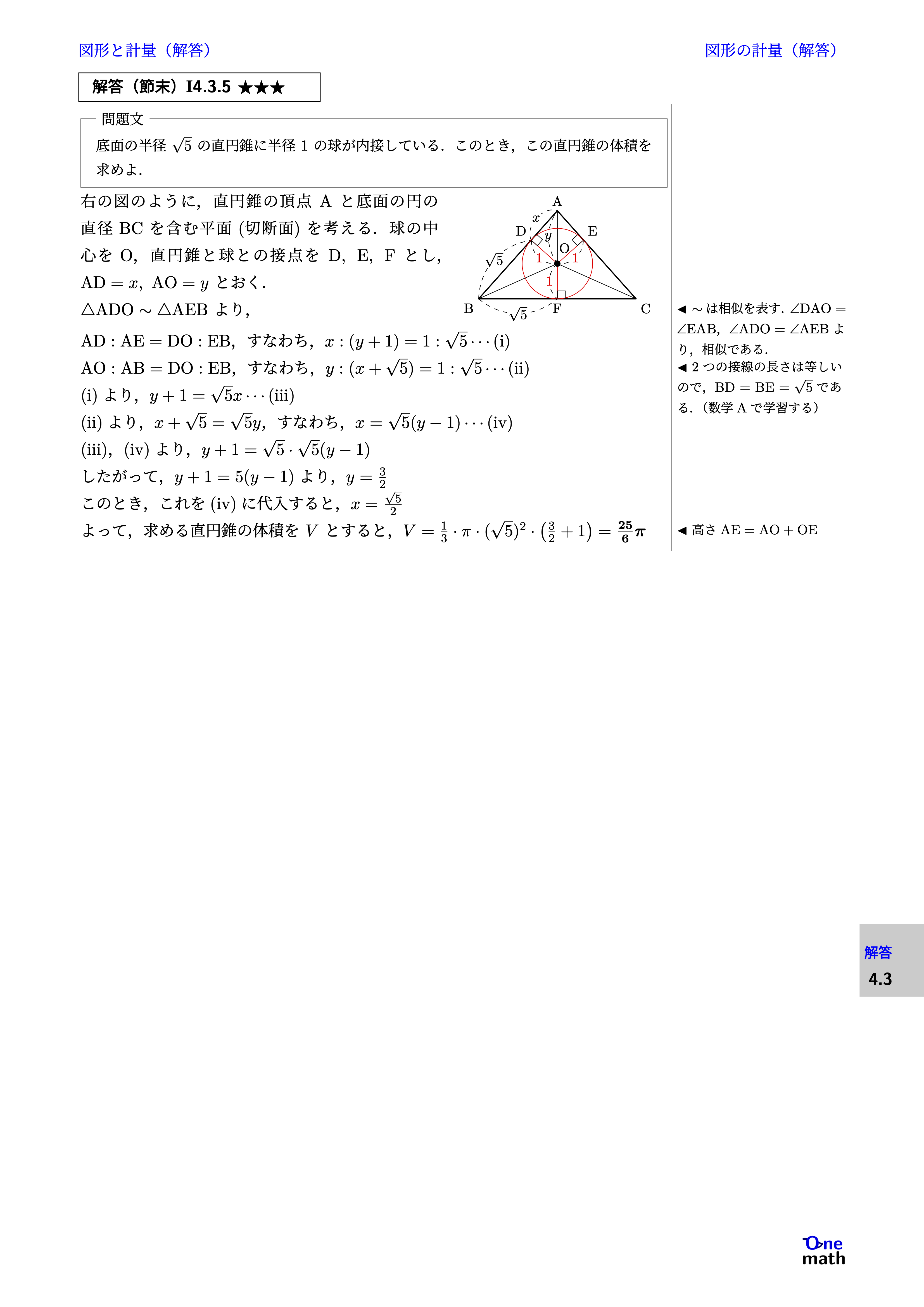 右の図のように,直円錐の頂点Aと底面の円の直径BCを含む平面(切断面)を考える. 球の中心をO,直円錐と球との接点を$\mathrm{D}, \mathrm{E}, \mathrm{F}$とし, $\mathrm{AD}=x, \mathrm{AO}=y$とおく. $\triangle \mathrm{ADO} \sim \triangle \mathrm{AEB}$より, $\mathrm{AD}: \mathrm{AE}=\mathrm{DO}: \mathrm{EB}$,すなわち,$x:(y+1)=1: \sqrt{5} \cdots(\mathrm{i})$ $\mathrm{AO}: \mathrm{AB}=\mathrm{DO}: \mathrm{EB}$,すなわち,$y:(x+\sqrt{5})=1: \sqrt{5}\cdots(\mathrm{ii})$ (i)より,$y+1=\sqrt{5} x\cdots(\mathrm{iii})$ (ii)より,$x+\sqrt{5}=\sqrt{5} y$,すなわち,$x=\sqrt{5}(y-1)\cdots(\mathrm{iv})$ (iii),(iv)より, $ y+1=\sqrt{5} \cdot \sqrt{5}(y-1) $ したがって,$y+1=5(y-1)$より,$y=\frac{3}{2}$ このとき,これを(iv)に代入すると,$x=\frac{\sqrt{5}}{2}$ よって,求める直円錐の体積を$V$とすると, $ V=\frac{1}{3} \cdot \pi \cdot(\sqrt{5})^2 \cdot\left(\frac{3}{2}+1\right)=\frac{25}{6}\pi $