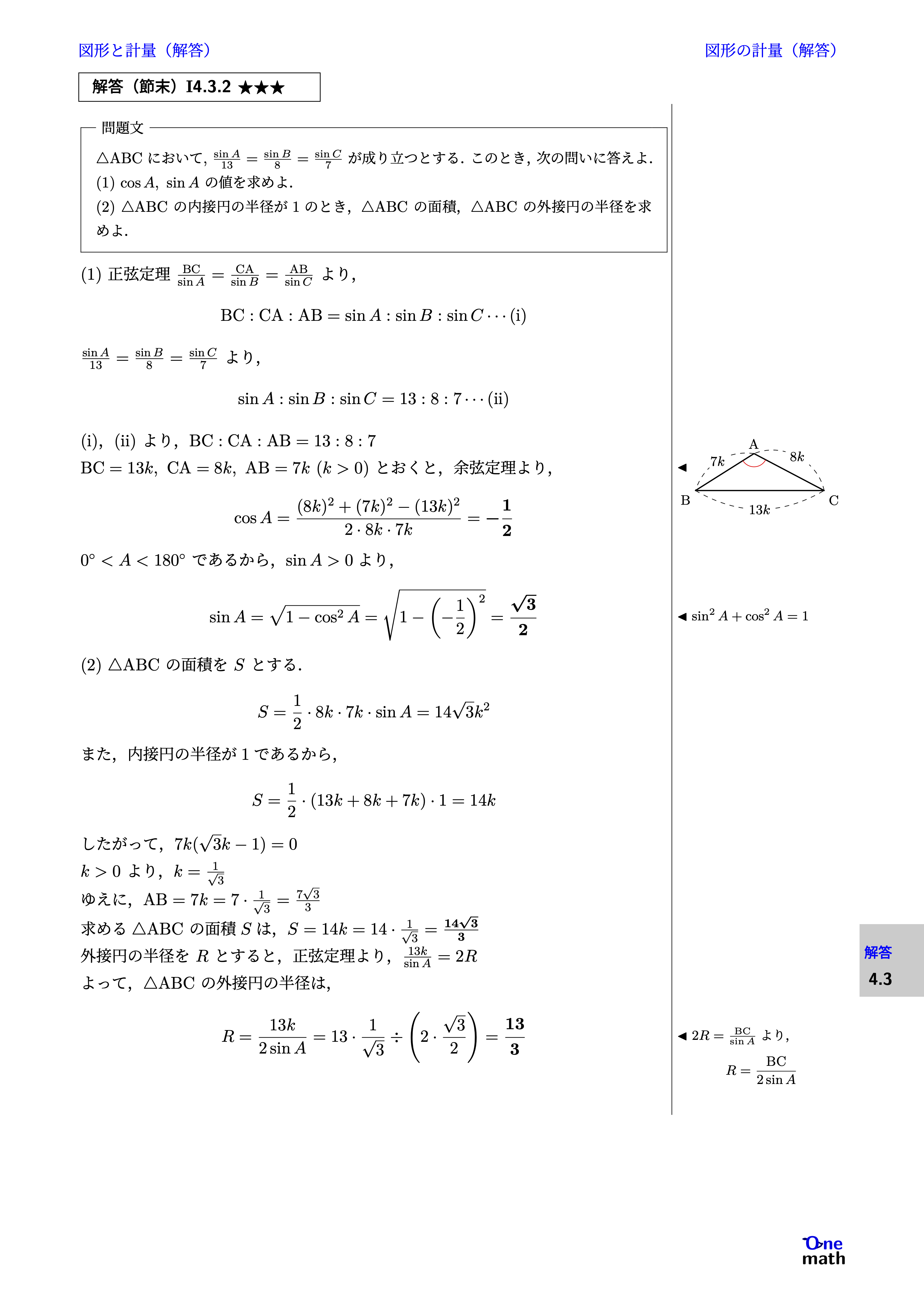 (1)正弦定理$\frac{\mathrm{BC}}{\sin A}=\frac{\mathrm{CA}}{\sin B}=\frac{\mathrm{AB}}{\sin C}$より, $$ \mathrm{BC}: \mathrm{CA}: \mathrm{AB}=\sin A: \sin B: \sin C\cdots(\mathrm{i}) $$ $\frac{\sin A}{13}=\frac{\sin B}{8}=\frac{\sin C}{7}$より, $$ \sin A: \sin B: \sin C=13: 8: 7\cdots(\mathrm{ii}) $$ (i),(ii)より,$\mathrm{BC}: \mathrm{CA}: \mathrm{AB}=13: 8: 7$ $\mathrm{BC}=13 k, \mathrm{CA}=8 k, \mathrm{AB}=7 k(k>0)$とおくと, 余弦定理より, $$ \cos A=\frac{(8 k)^2+(7 k)^2-(13 k)^2}{2 \cdot 8 k \cdot 7 k}=-\frac{1}{2} $$ $0^{\circ}<A<180^{\circ}$であるから,$\sin A>0$より, $$ \sin A=\sqrt{1-\cos ^2 A}=\sqrt{1-\left(-\frac{1}{2}\right)^2}=\frac{\sqrt{3}}{2} $$ (2)$\triangle \mathrm{ABC}$の面積を$S$とする. $$ S=\frac{1}{2} \cdot 8 k \cdot 7 k \cdot \sin A=14\sqrt{3}k^2 $$ また,内接円の半径が1であるから, $$ S=\frac{1}{2}\cdot(13 k+8 k+7 k)\cdot 1=14k $$ したがって,$ 7k(\sqrt{3} k-1)=0 $ $k>0$より,$k=\frac{1}{\sqrt{3}}$ ゆえに,$\mathrm{AB}=7 k=7\cdot \frac{1}{\sqrt{3}}=\frac{7\sqrt{3}}{3}$ 求める$\triangle \mathrm{ABC}$の面積$S$は,$S=14k=14\cdot \frac{1}{\sqrt{3}}=\frac{14\sqrt{3}}{3}$ 外接円の半径を$R$とすると,正弦定理より, $ \frac{13 k}{\sin A}=2 R $ よって,$\triangle \mathrm{ABC}$の外接円の半径は, $$ R=\frac{13 k}{2 \sin A}=13 \cdot \frac{1}{\sqrt{3}} \div \left(2\cdot \frac{\sqrt{3}}{2}\right)=\frac{13}{3} $$