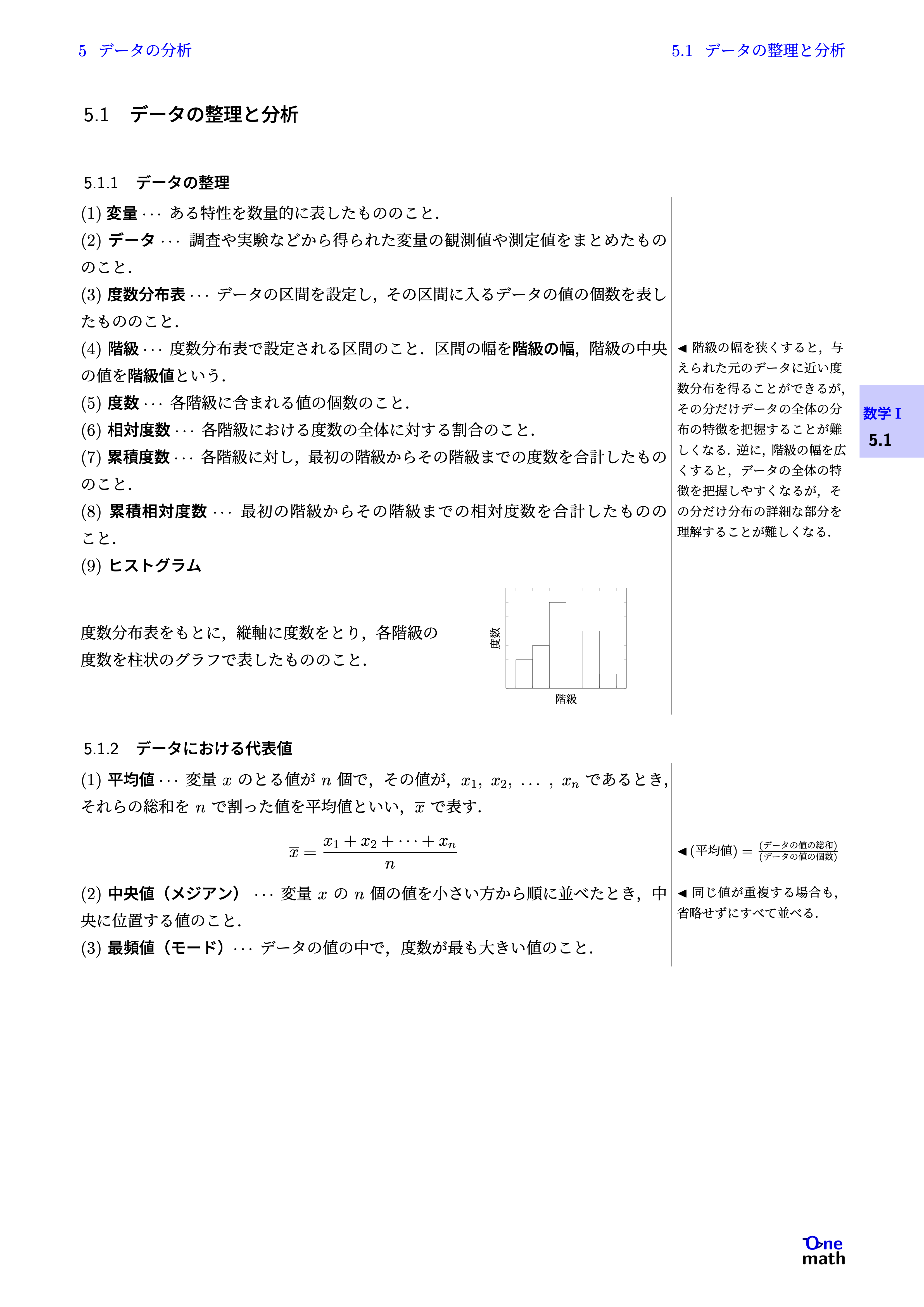 (1)変量$\cdots$ある特性を数量的に表したもののこと. (2)データ$\cdots$調査や実験などから得られた変量の観測値や測定値をまとめたもののこと. (3)度数分布表$\cdots$データの区間を設定し,その区間に入るデータの値の個数を表したもののこと. (4)階級$\cdots$度数分布表で設定される区間のこと.区間の幅を階級の幅,階級の中央の値を階級値という. (5)度数$\cdots$各階級に含まれる値の個数のこと. (6)相対度数$\cdots$各階級における度数の全体に対する割合のこと. (7)累積度数$\cdots$各階級に対し,最初の階級からその階級までの度数を合計したもののこと. (8)累積相対度数$\cdots$最初の階級からその階級までの相対度数を合計したもののこと. (9)ヒストグラム 度数分布表をもとに,縦軸に度数をとり,各階級の度数を柱状のグラフで表したもののこと.