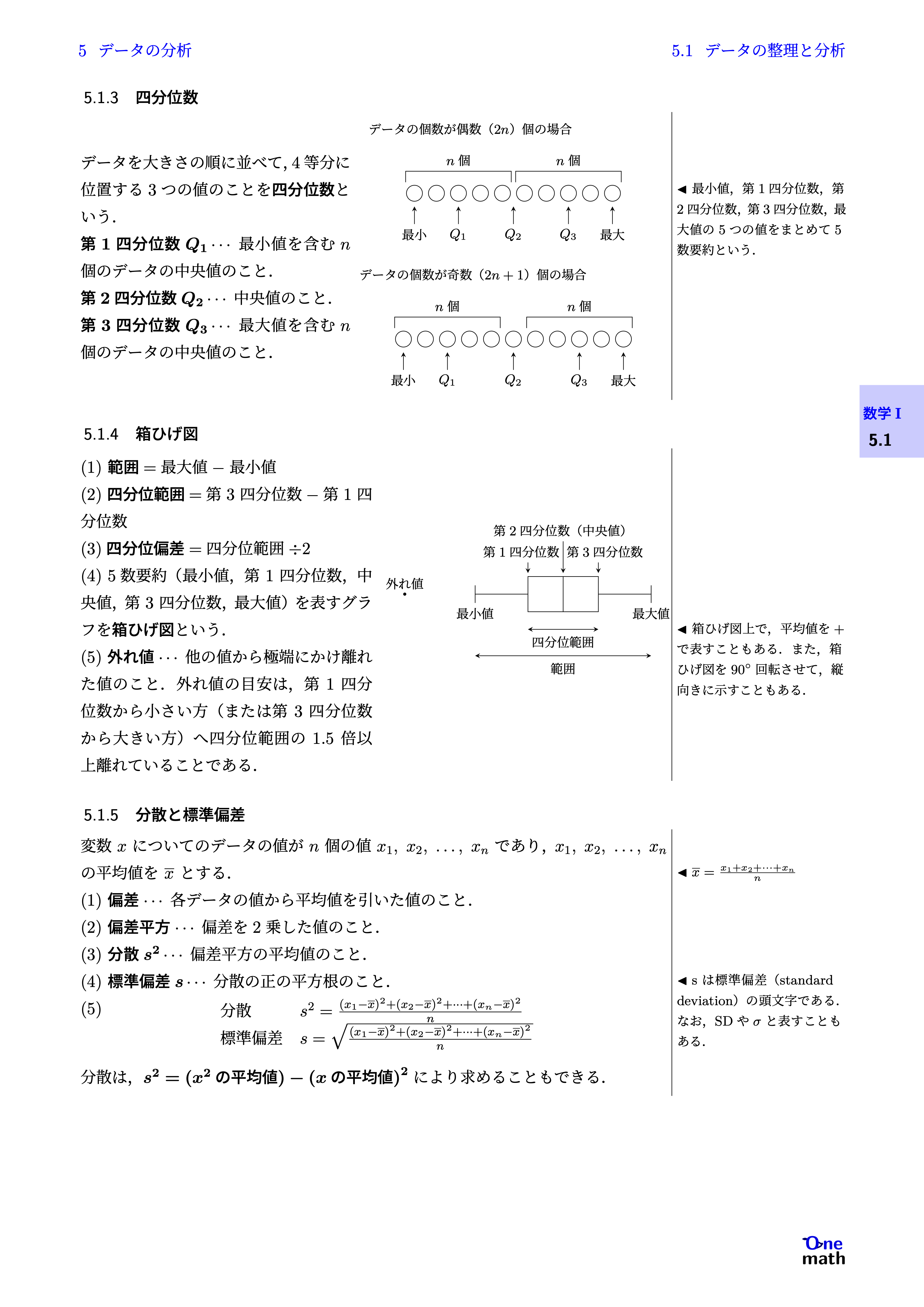 (1)範囲$=$最大値$-$最小値 (2)四分位範囲$=$第3四分位数$-$第1四分位数 (3)四分位偏差$=$四分位範囲$\div 2$ (4)5数要約(最小値,第1四分位数,中央値,第3四分位数,最大値)を表すグラフを箱ひげ図という. (5)外れ値$\cdots$他の値から極端にかけ離れた値のこと.外れ値の目安は,第1四分位数から小さい方(または第3四分位数から大きい方)へ四分位範囲の$1.5$倍以上離れていることである.