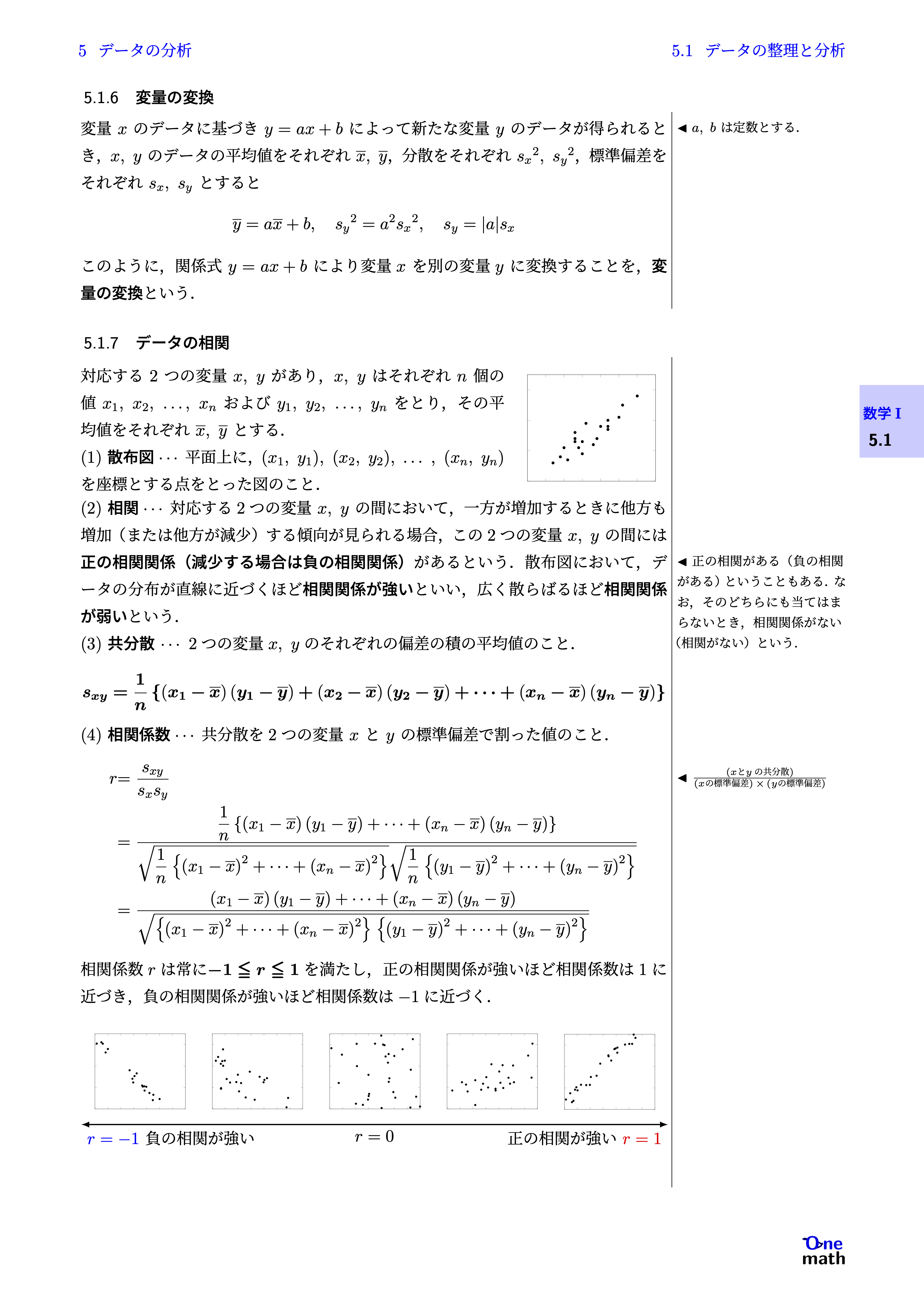 変量$x$のデータに基づき$y=ax+b$によって新たな変量$y$のデータが得られるとき,$x, y$のデータの平均値をそれぞれ$\overline{x},\overline{y}$,分散をそれぞれ${s_x}^2,{s_y}^2$,標準偏差をそれぞれ$s_x,s_y$とすると$$ \overline{y}=a\overline{x}+b,{s_y}^2=a^2 {s_x}^2,s_y=|a| s_x$$このように,関係式$y=ax+b$により変量$x$を別の変量$y$に変換することを,変量の変換という.