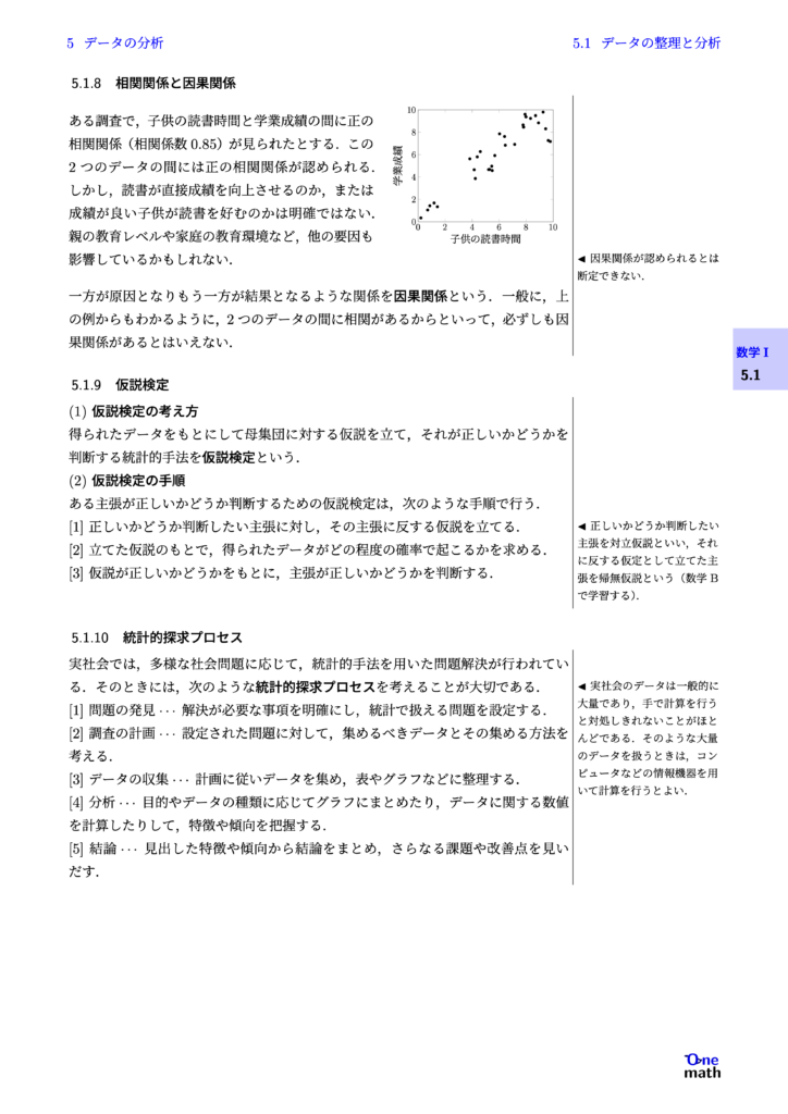 実社会では,多様な社会問題に応じて,統計的手法を用いた問題解決が行われている.そのときには,次のような統計的探求プロセスを考えることが大切である. [1]問題の発見$\cdots$解決が必要な事項を明確にし,統計で扱える問題を設定する. [2]調査の計画$\cdots$設定された問題に対して,集めるべきデータとその集める方法を考える. [3]データの収集$\cdots$計画に従いデータを集め,表やグラフなどに整理する. [4]分析$\cdots$目的やデータの種類に応じてグラフにまとめたり,データに関する数値を計算したりして,特徴や傾向を把握する. [5]結論$\cdots$見出した特徴や傾向から結論をまとめ,さらなる課題や改善点を見いだす.