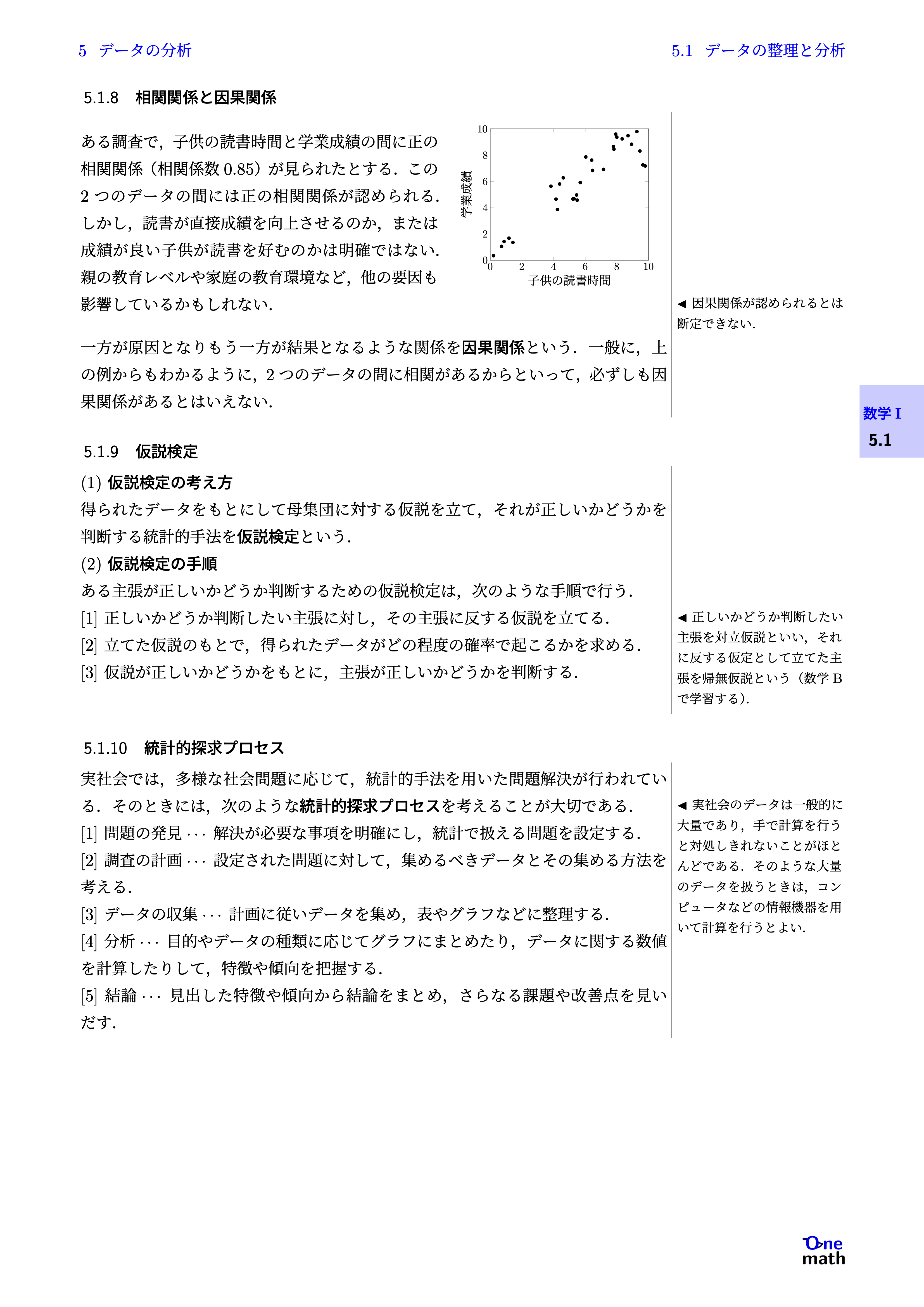 ある調査で,子供の読書時間と学業成績の間に正の相関関係(相関係数0.85)が見られたとする.この2つのデータの間には正の相関関係が認められる.しかし,読書が直接成績を向上させるのか,または成績が良い子供が読書を好むのかは明確ではない.親の教育レベルや家庭の教育環境など,他の要因も影響しているかもしれない. 一方が原因となりもう一方が結果となるような関係を因果関係という.一般に,上の例からもわかるように,2つのデータの間に相関があるからといって,必ずしも因果関係があるとはいえない.